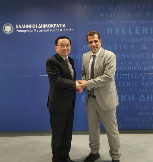 2025年9月15日,驻希腊大使方遒拜会希腊新任移民和庇护部部长普莱夫利斯,双方就加强移民治理交流合作、维护在希中国公民合法权益等议题交换意见。希腊移民和庇护部外事顾问尤托普洛斯、部长办公室主任切利斯等在座。