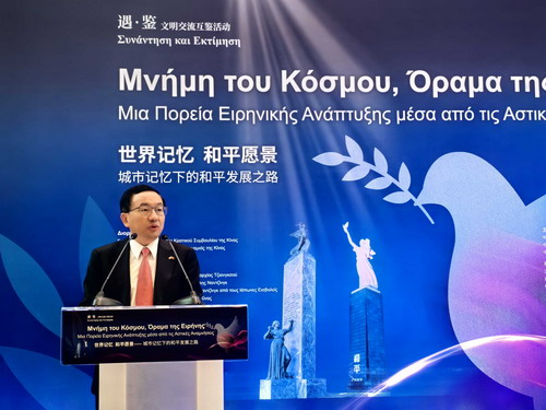 2025年9月25日,驻希腊大使方遒出席《世界记忆 和平愿景——城市记忆下的和平发展之路》主题展览开幕式并致辞。中央文明办专职副主任胡凯红、希腊阿提卡省副省长弗拉霍斯等100余名中希各界友好人士参加。