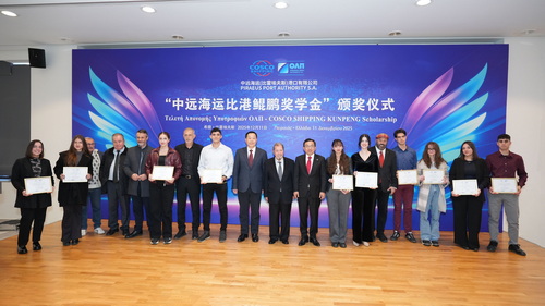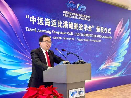 2025年12月11日,驻希腊大使方遒出席首届“中远海运比港鲲鹏奖学金”颁奖仪式并致辞。希腊议会希中友好小组主席特拉加基斯,比雷埃夫斯、佩拉马等比港周边四市市长及工会、学校代表百余人参加。