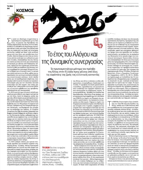 2025年12月27日,驻希腊大使方遒在希腊主流媒体《消息报》及其网站版发表新年贺词,向希腊各界朋友和在希华侨华人致以诚挚的新年问候。方大使在贺词中系统回顾2025年中希关系稳步发展取得的丰硕成果,并积极展望双边关系向前发展的广阔前景,表示2026年是中国“十五五”规划开局之年,也是中希建立全面战略伙伴关系二十周年,中方愿同希方一道,把握“十五五”时期发展新机遇,持续深化各领域交流合作,推动中希关系不断迈上新台阶,更好造福两国人民。全文如下: