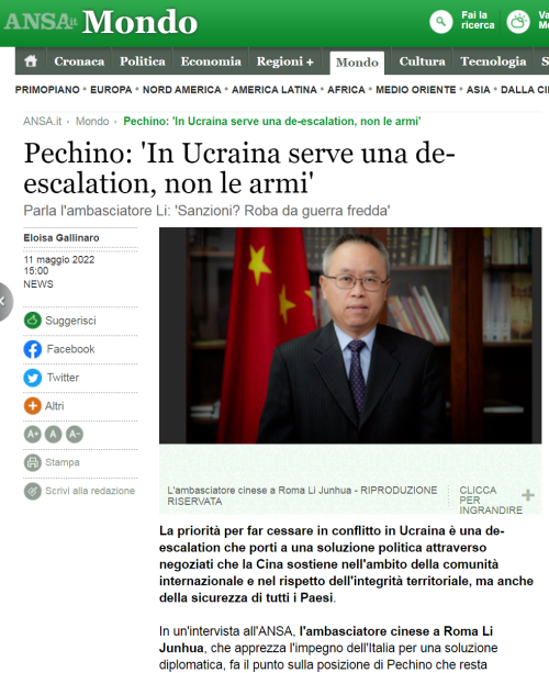 2022年5月11日,驻意大利大使李军华接受意安莎社采访,全文如下: