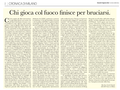 2022年8月5日,驻米兰总领事刘侃在意大利主流媒体《晚邮报》发表署名文章《玩火者必自焚》,全文如下: