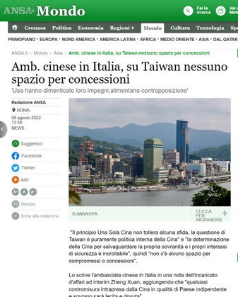 2022年8月8日,意大利安莎社刊载驻意大利使馆临时代办郑璇署名文章《一个中国原则不容挑战》,全文如下: