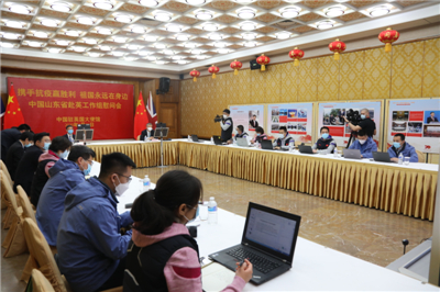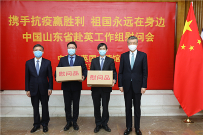 2020年3月30日上午,山东省赴英联合工作组在驻英国使馆举行“携手抗疫赢胜利,祖国永远在身边”中资机构人员慰问会。驻英国大使刘晓明、工作组领队、山东省人大常委会副主任王华出席并讲话,现场向中资机构代表发放了防疫慰问品。工作组的医学专家们就疫病诊疗、疫情防控、中医药预防治疗等问题举行专题讲座,并对中资机构人员关注的防疫问题线上答疑。全英300余名在英中资机构员工及家属通过视频连线方式参加。