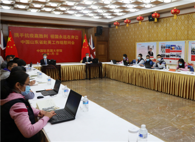 2020年4月1日,山东省联合工作组在驻英国使馆为在英华侨华人举办第二场在线慰问交流会。驻英国大使刘晓明和联合工作组领队、山东省人大常委会副主任王华出席并讲话。来自英格兰北部、苏格兰和北爱尔兰地区约400名侨胞连线参加。