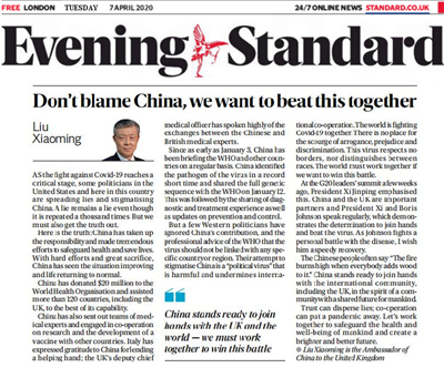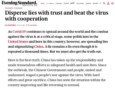 2020年4月7日,英国主流报纸《旗帜晚报》在网络版和纸质版分别以《驱散谎言,坚定信心,携手合作,战胜疫情》和《停止指责、合作抗疫》为题,刊登驻英国大使刘晓明署名文章。全文如下: