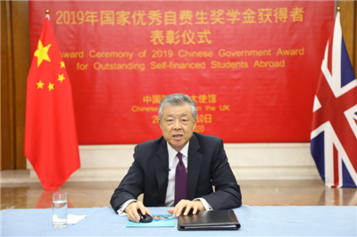 2020年6月10日,驻英国使馆举行2019年度国家优秀自费留学生奖学金在线颁奖仪式。驻英国大使刘晓明、驻曼彻斯特总领事郑曦原、驻爱丁堡总领事马强、驻贝尔法斯特总领事张美芳、奖学金获得者及导师、评审专家代表、在英留学人员近300人等通过视频连线方式参加。