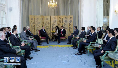 当地时间6月18日下午,国务院总理李克强在伦敦会见英国48家集团俱乐部主席佩里和“青年破冰者”代表,并同他们进行了交流。