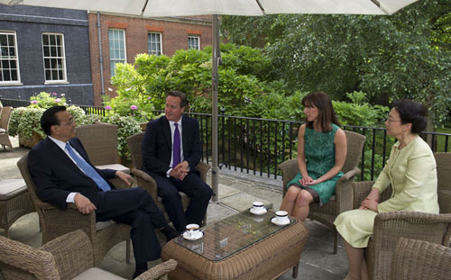 和熙的阳光洒在英国首相府的花园里,藤编的小桌上摆放着精美的茶具、茶点。当地时间17日下午,李克强总理繁忙的访英日程中被插入了一项相对轻松的安排:他携夫人程虹在唐宁街10号与卡梅伦夫妇一边品茶,一边畅叙友谊,在国际政治、经贸合作等“硬”话题之外,展开了一段软实力魅力外交。