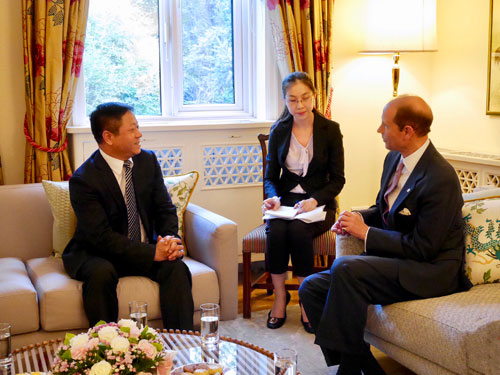 2018年6月5日,外交部部长助理张汉晖应邀出席英国驻华使馆举行的国庆招待会,并与来华访问的英国威塞克斯伯爵爱德华王子、英驻华大使吴百纳就中英关系、两国人文交流等交换意见。