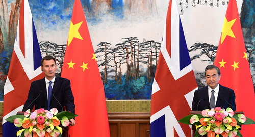 王毅表示,亨特外交大臣上任不足一个月即来北京举行第九次中英战略对话,充分显示英方对发展双边关系的高度重视。刚才我和亨特外交大臣的会谈富有成果,达成很多共识。我们一致认为,要进一步充实和提升双边关系的战略内涵。两国领导人已就打造中英关系“黄金时代”达成重要共识,我们应切实提升双边关系的战略性、务实性、全球性和包容性,让“黄金时代”成色更足、亮点更多、走得更稳。我们应客观看待彼此的发展,巩固和提升战略互信,和平共处,良性竞争,共同发展,做新型大国关系的典范。双方愿保持高层交往势头,加强对两国关系的政治引领,中方欢迎更多英国王室成员访华。双方还将办好经济财金、人文、安全等领域机制性对话,支持立法机构、政党、地方、军队加强交往。
