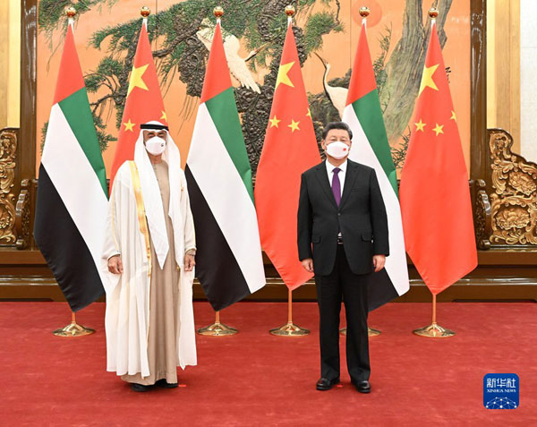 2022年2月5日下午,国家主席习近平在人民大会堂会见来华出席北京2022年冬奥会开幕式的阿联酋阿布扎比王储穆罕默德。