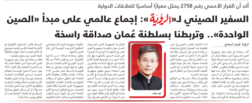 2025年10月15日,驻阿曼大使吕健在阿主流媒体《观点报》发表署名文章《一个中国原则与联大第2758号决议》,介绍台湾问题的历史经纬,阐述一个中国原则和中方关于联大第2758号决议的立场。全文如下:
