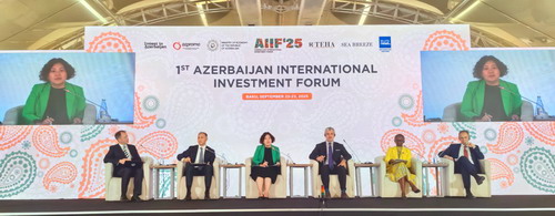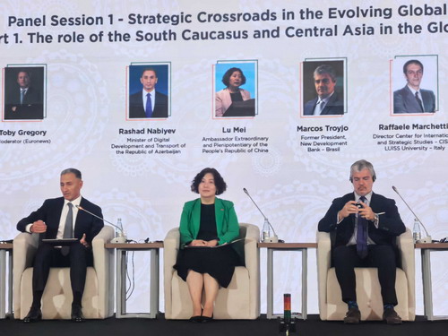 2025年9月22日,驻阿塞拜疆大使鲁梅应邀出席阿塞拜疆第一届国际投资论坛,并在“南高加索与中亚在全球格局的角色”专题讨论会作主旨发言,阐述世界经济形势、中国经济发展成就、中阿合作和共建“一带一路”等内容,并回答主持人提问。