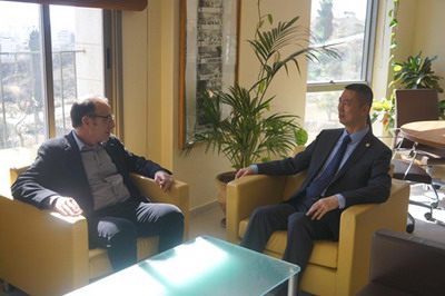 2019年11月11日,驻巴勒斯坦办事处主任郭伟会见巴勒斯坦经济政策研究所(MAS)主任哈利迪。