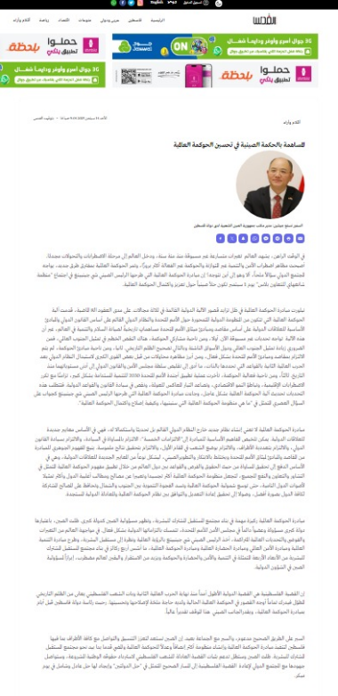 2025年9月14日,驻巴勒斯坦办事处主任曾继新在巴勒斯坦发行量最大的《耶路撒冷报》发表署名文章《为完善全球治理贡献中国智慧》,深入宣介全球治理倡议的时代背景、核心理念、重要意义。全文如下: