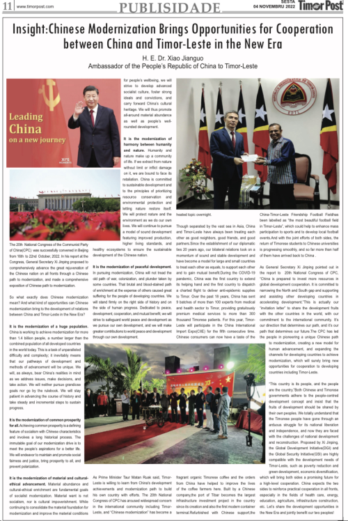 2022年11月4日,驻东帝汶大使肖建国在东发行量最大报《东帝汶之声》“中国专栏”发表题为《从中国式现代化看新时代中东合作机遇》的英文署名文章,积极宣介中国共产党第二十次全国代表大会,全文如下: