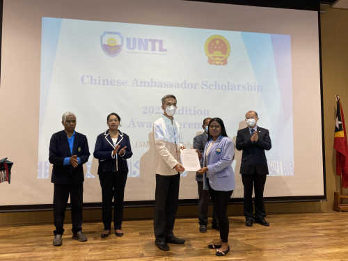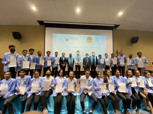 2022年12月15日,驻东帝汶大使肖建国出席在东帝汶国立大学海拉校区举办的2022年度“中国大使奖学金”颁奖仪式,向100名获得奖学金的学生颁奖。东国立大学校长马丁斯,东高等教育、科学与文化部代表路易斯,获奖学生和部分师生及家长代表等参加。