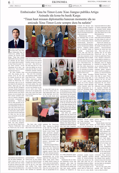 2022年12月19日,驻东帝汶大使肖建国在东发行量最大报《东帝汶之声》发表德顿语离任署名文章《出使四载如一瞬,中东友谊心永存》。全文如下: