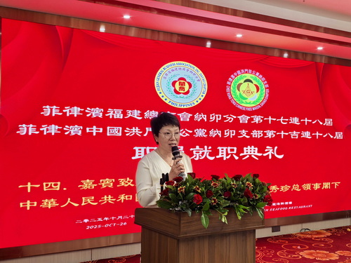 2025年10月26日,驻达沃总领事赵秀珍出席菲律宾福建总商会达沃分会、菲律宾中国洪门致公党达沃支部换届就职活动。