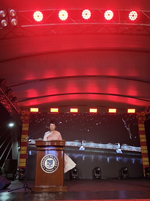 赵秀珍总领事在致辞中表示,布卡纳大桥成为了今年欢庆中国春节的场地,它是我们送给达沃市民的一份礼物。大桥屹立于此,正如一匹昂首奔腾的骏马,象征着达沃这座城市正以稳健而又充满活力的步伐,向着机遇与希望奋勇前进。祝愿中菲两国人民在新的一年以崭新的面貌与十足的干劲,迎接更加美好的明天。