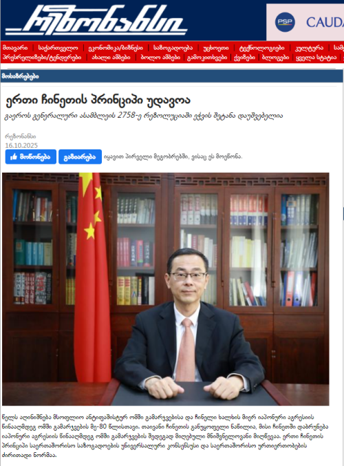 2025年10月17日,驻格鲁吉亚大使周谦在格发行量最大的报纸之一《回声报》及其网站发表题为《一个中国原则不容置疑 联大第2758号决议不容挑战》的署名文章。全文如下: