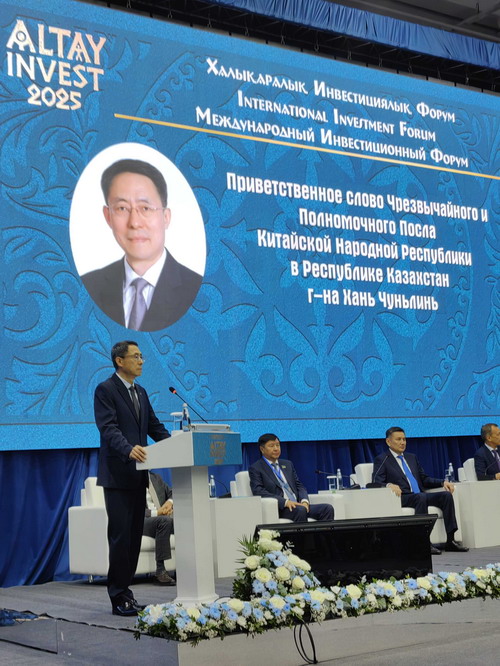 2025年9月26日,驻哈萨克斯坦大使韩春霖出席“阿尔泰投资-2025”论坛开幕式并致辞。
