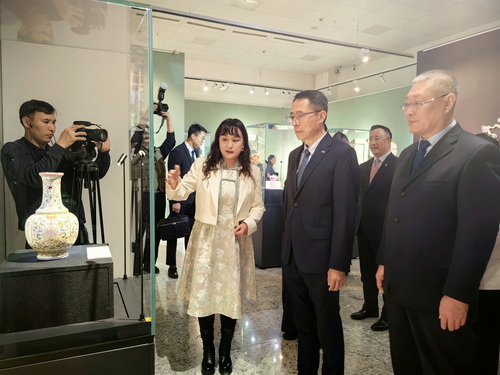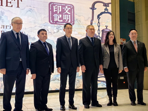 2025年10月22日,驻哈萨克斯坦大使韩春霖出席在哈国家博物馆举办的“文明印记——中国古代工艺文物精华展”开幕式,哈文信部文化委员会主席达克诺夫现场宣读巴拉耶娃部长贺信,哈国家博物馆馆长阿卜迪加济耶夫、天津市文物局局长徐恒秋等出席并致辞。