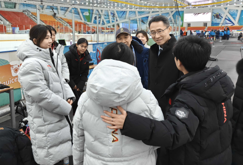 2025年11月14日,驻哈萨克斯坦大使韩春霖在比赛现场看望慰问来哈参加国际滑冰联盟短道速滑青年世界杯的中国短道速滑队运动员、教练员及工作人员。