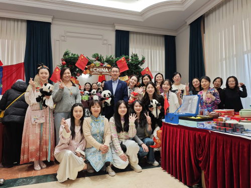 使馆义卖展台洋溢浓浓“中国风”,来宾络绎不绝,踊跃购买和打卡留念。精美茶具、真丝饰品、熊猫玩偶等50余种中国特色工艺品琳琅满目,扬州炒饭和中式炒面等美食吸引顾客驻足品尝。使馆外交官身着中式服装热情“带货”,介绍展品文化深意。使馆展台成为展示中国文化、演绎中国风采的独特舞台。
