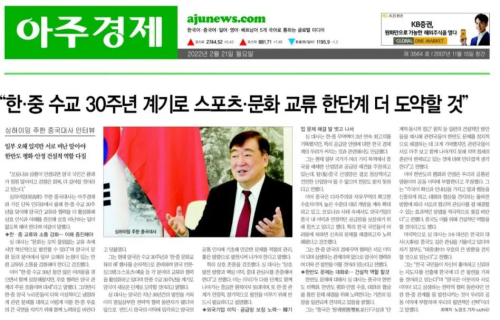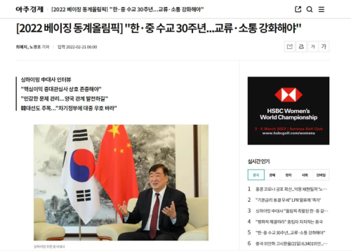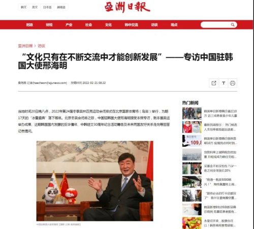 2022年2月21日,韩国《亚洲日报》《亚洲经济》在其纸质报刊和官方网站分别以中文、韩文发布对驻韩国大使邢海明专访。邢海明大使在专访中回顾北京冬奥会盛况,介绍中国经济形势,并就中韩关系、产业链供应链、民间友好等问题等回答记者提问。采访实录如下: