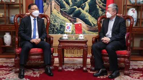 张总领事祝贺申履新,表示今年是中韩建交30周年,建交以来两国关系取得了飞跃式发展,去年中韩经贸合作克服疫情冲击逆势上扬,双边贸易额突破3400亿美元。申局长多年从事农产品进出口工作,希望今后以推动全罗南道与中国的农产品贸易为突破口,带动双方各领域交流合作更加活跃。