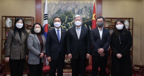 2022年3月21日,驻光州总领事张承刚会见全罗南道新任国际协力官申贤坤,中国合作组长河珖玧等参加。