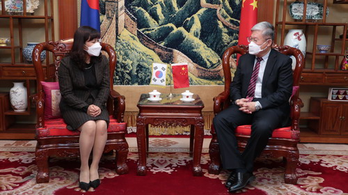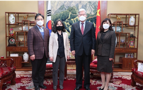 2022年4月1日,驻光州总领事张承刚在馆内会见到访的韩国圆光大学孔子学院中韩方院长卢锦淑、郑贤珠和校长秘书室长姜延锡。