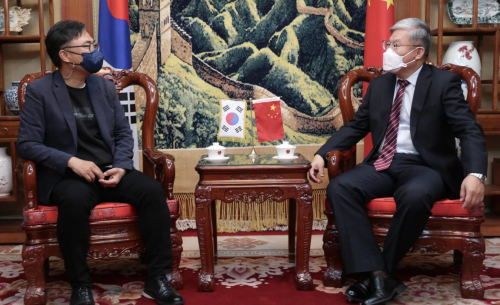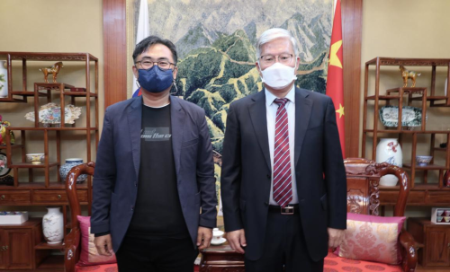 2022年4月28日,驻光州总领事张承刚在馆内会见韩中全球协会会长禹守根。