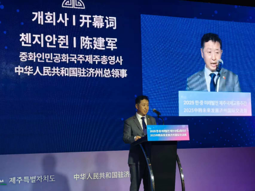 陈建军总领事在致辞中表示,中韩建交33年来,两国经贸合作持续深化,为区域经济发展注入稳定动力与蓬勃活力。总领馆将继续支持济州道与中国各地拓展各领域交流,深化务实合作,为两国产业升级和经济发展贡献力量。