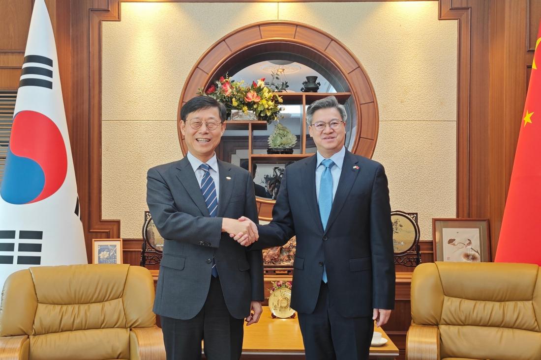 2026年1月15日,驻釜山总领事陈日彪在馆内会见釜山港湾公社社长、前海洋水产部次官宋相根,就加强中韩港口及海运交流合作等交换意见。釜山港湾公社副社长具滋琳等在座。