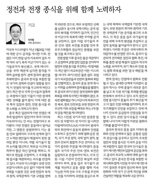 2026年4月21日,驻韩国大使戴兵在韩国《韩民族日报》发表题为《共同努力推动停火止战》的署名文章,介绍中方在伊朗局势上的立场态度以及为停火止战所作努力,强调当前局势来到战和转换的关键阶段,中方愿同包括韩国在内的国际社会一道,本着习近平主席提出的四点重要主张精神,为推动局势缓和、促进地区国家关系改善发挥建设性作用。全文如下: