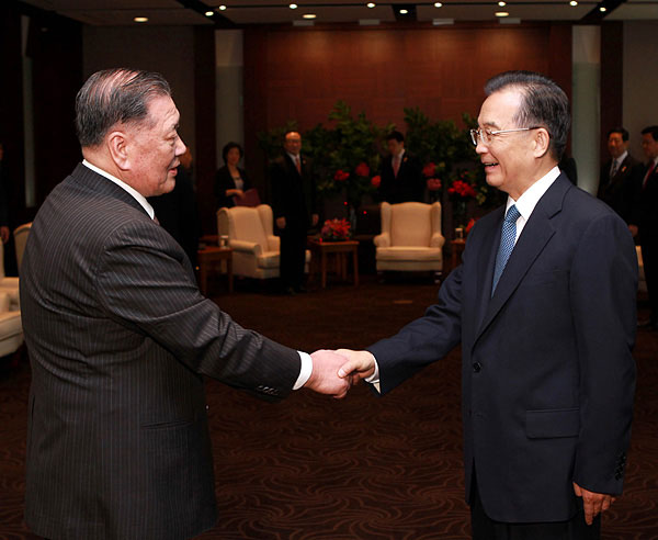 温家宝说,中韩建交18年来,双边经贸合作发展很快,成果丰硕,成为两国关系的重要推动力。韩国经济和企业界已成为连接两国友谊与合作的纽带。面对国际金融危机的冲击,中韩两国积极采取有效措施,较快克服困难,实现了本国经济企稳回升,也为促进世界经济复苏作出了贡献。目前,世界经济仍存在诸多不稳定、不确定因素,我们丝毫不能放松。中韩作为亚洲重要经济体,要保持各自经济政策的连续性和稳定性以及应对危机措施的力度,同时继续发扬同舟共济的精神,坚持优势互补,推动两国经贸合作再上新台阶。要本着先易后难、求同存异、循序渐进的原则,推进中韩自贸区建设。中韩两国都在转变经济发展方式,调整经济结构,双方要把握这一新的机遇,把高新技术、节能环保、低碳绿色经济作为新的合作重点。中方欢迎韩国企业扩大对华投资,凡是在中国依法经营的外国企业,我们都一视同仁,给予国民待遇。中国政府支持两国中小企业加强合作,并为此创造更好的环境和条件。希望韩国经济、企业界为促进两国友好合作作出新的贡献。