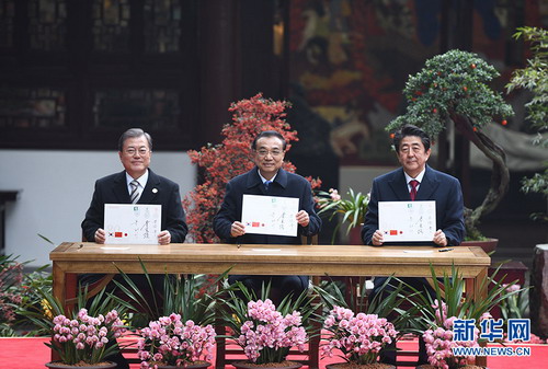 2019年12月24日下午,国务院总理李克强在四川成都杜甫草堂博物馆与韩国总统文在寅、日本首相安倍晋三共同出席中日韩合作20周年纪念活动。