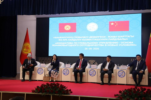 2025年9月26日,驻吉尔吉斯斯坦使馆同吉总统办公厅、吉国立大学共同举办全球治理倡议研讨会。驻吉尔吉斯斯坦大使刘江平出席并作主旨报告,吉副总理拜萨洛夫、议员、吉国立大学校长、各高校和科研机构负责人发言,吉各高校师生代表逾100人参加。