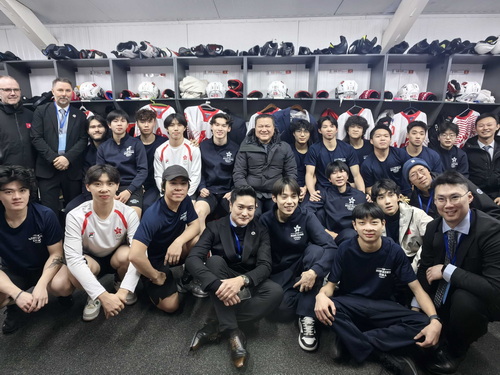 中国香港冰球协会主席、国际冰球联合会亚洲理事会委员陈恩永和队员们感谢使馆关怀,表示将在赛场全力以赴,奋勇争先,为祖国增光添彩。