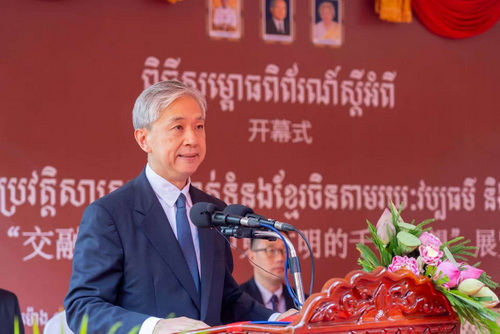 2025年11月19日,驻柬埔寨大使汪文斌同柬文化艺术大臣彭萨格娜共同出席“交融与共生:中柬文明的千年回望”展览开幕式并致辞。