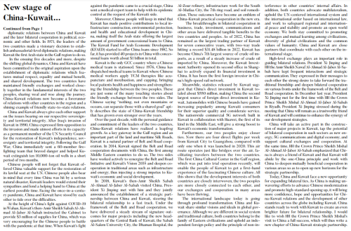 2023年9月21日,驻科威特大使张建卫在科主流媒体《消息报》、《报章报》、《火炬报》、《舆论报》、《白天报》、《政治报》、《科威特时报》、《阿拉伯时报》发表署名文章《中科战略伙伴关系进入新阶段》,全文如下: