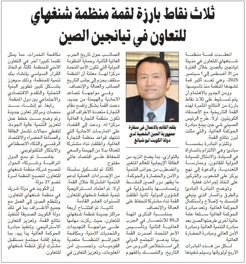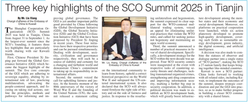 2025年9月5日,驻科威特使馆临时代办刘翔在科主流媒体《消息报》、《报章报》、《舆论报》、《阿拉伯时报》等发表署名文章《上合组织天津峰会的三大亮点》,全文如下: