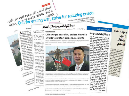 2026年3月18日,驻科威特大使杨欣在《消息报》、《舆论报》、《报章报》、《政治报》、《白天报》、《阿拉伯时报》、《科威特时代》及Q8新闻等主流媒体发表署名文章《为止战呐喊,为和平奔走》。全文如下: