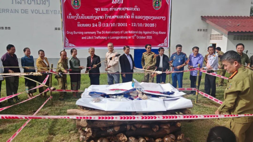 2025年11月6日,在第24个老挝国家禁毒日来临之际,琅勃拉邦省举行禁毒群众大会暨毒品销毁活动,驻琅勃拉邦总领事张社平应邀出席。琅勃拉邦省委书记本倰、市委书记萨南、省公安厅等各单位负责人及学生代表等近千人参加活动。