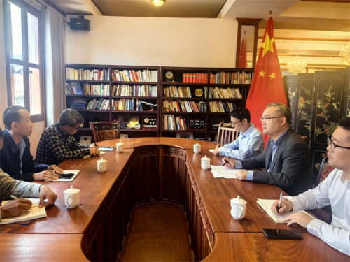 张社平总领事认真听取学员代表介绍在华培训见闻和心得,祝贺他们学有所获。