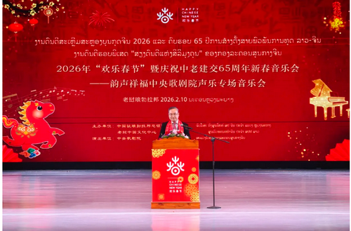 2026年2月10日,由驻琅勃拉邦总领事馆和老挝中国文化中心共同主办、中国中央歌剧院演出的2026“欢乐春节”暨庆祝中老建交65周年新春音乐会在琅勃拉邦举行。驻琅勃拉邦总领事张社平、老挝中国文化中心主任罗卫建,老挝琅勃拉邦省委副书记坎腊、南塔省政府副主席蓬乔及老北六省政府代表,领区侨胞、中资机构、华校师生代表等近千人出席。