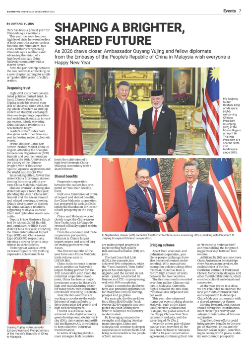 2025年12月31日,驻马来西亚大使欧阳玉靖在马来西亚中文、英文、马来文主流媒体《星洲日报》《星报》《阳光日报》发表题为《友谊长青讴歌伟大时代 命运与共再续恢弘华章》的署名文章,并祝马来西亚读者新年快乐。文章全文如下: